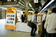3番線ホームの車両展示会の入口付近。ここでA4判のパンフレット,“313系新製車両デビュー”と裏面が“10月1日ダイヤ改正”を受け取ってからモハ313-5001の大垣方ドアから車内へ入る。