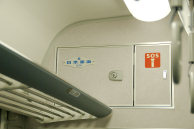 車端部の車両会社と製造年を示すプレートがある付近。“SOS”の表示があるところには,非常用の機材が格納されているものと思われる。