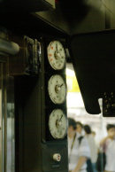 運転台の左側にある柱には,従来タイプにはなかった電流計が設置された。力行時は針が右側へ,回生・発電ブレーキ時は左側に振れる。中央は架線の電圧,下は制御用電源の電圧を示している。