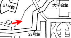 教養キャンパス南西部の林で,右の建物は23号館です。